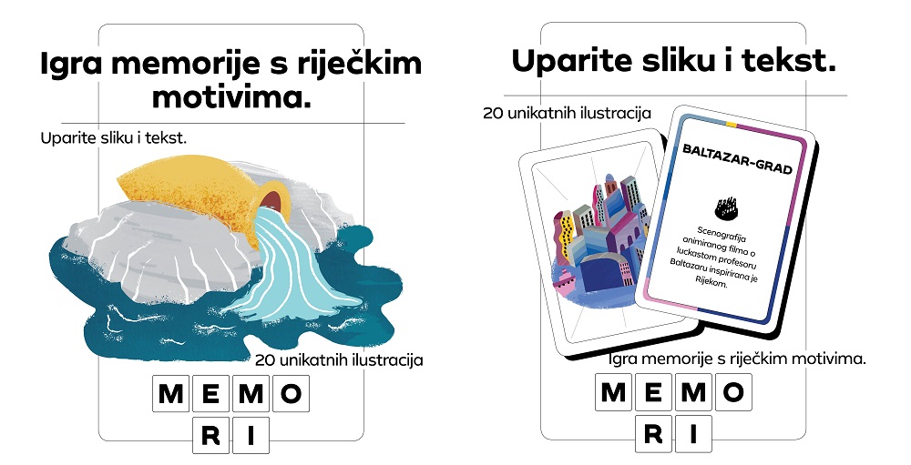 Kombinirajući zabavu i znanje, MEMORI kroz dvadeset parova istražuje, obrađuje i svjedoči bogatom povijesnom nasljeđu Rijeke. Od tradicionalne igre razlikuje se po dvije vrste kartica – slikovne i one tekstualne s kratkim opisom motiva. U pronalaženju parova, igra tako postaje bogatija za obrazovnu dimenziju. Igraće kartice nadopunjuje knjižni blok s opisom motiva te mapa grada s njihovim lokacijama. U osmišljavanju je potaknuta suradnja akademske i kreativne zajednice, dok je lokalna uključena kroz javnu kampanju za odabir motiva. Svi elementi igre originalno su autorsko djelo. Ilustracije potpisuje riječka umjetnica Ana Glažar, autorske tekstove publicist Velid Đekić, a vizualno oblikovanje dizajner Jan Pavlović.